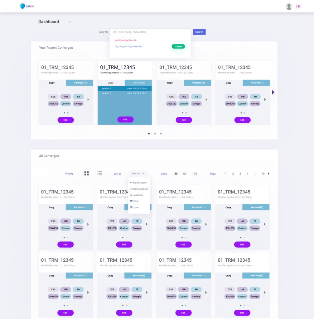 From discovery sessions, the need for a dashboard was becoming the most-requested feature. The dashboard curated all the working converge numbers into a UI that allowed the user to search and filter what converges they need at the time, but also allowed the user to see all converge numbers created in the Triton database.