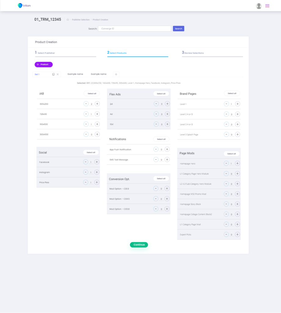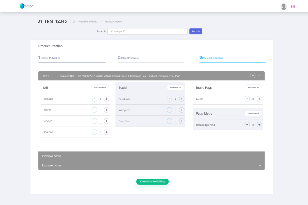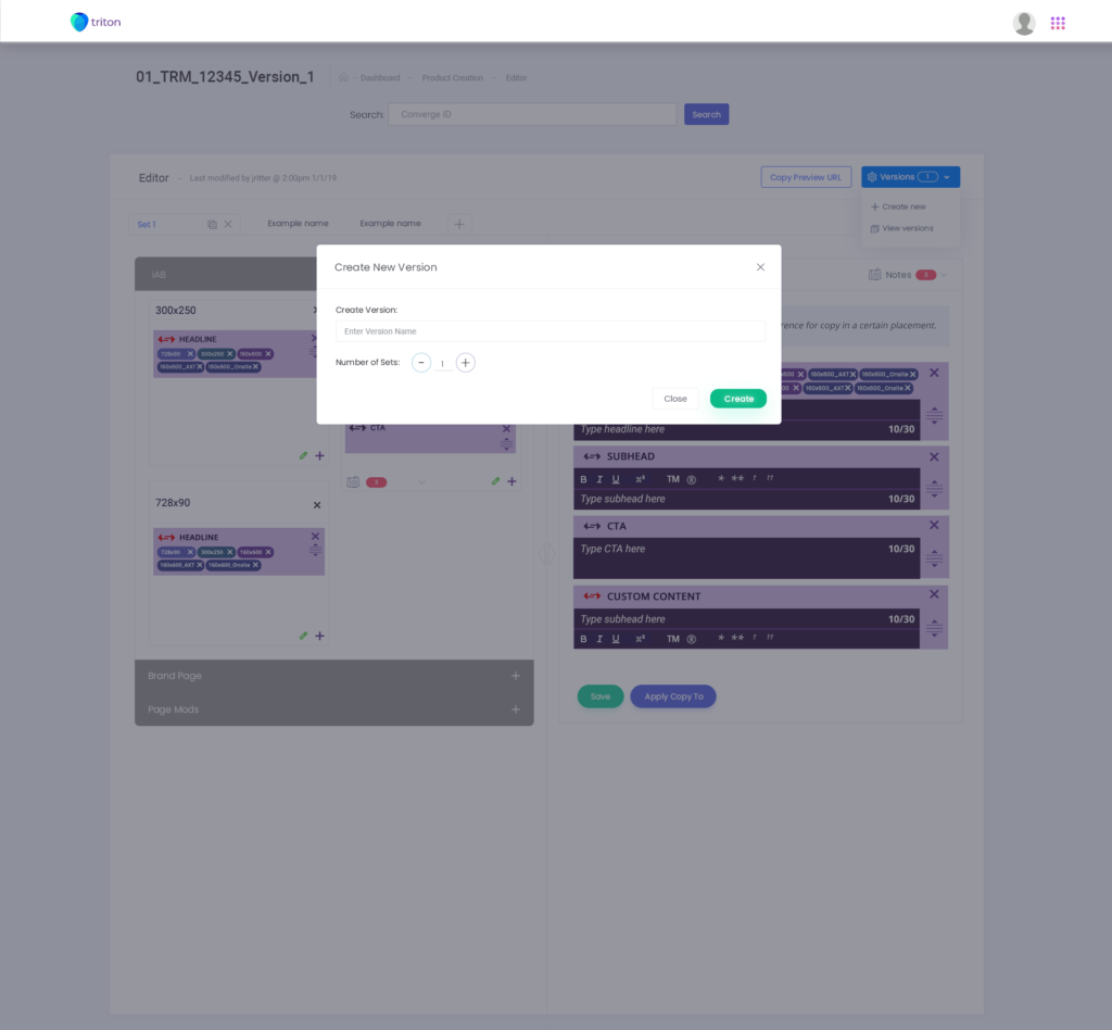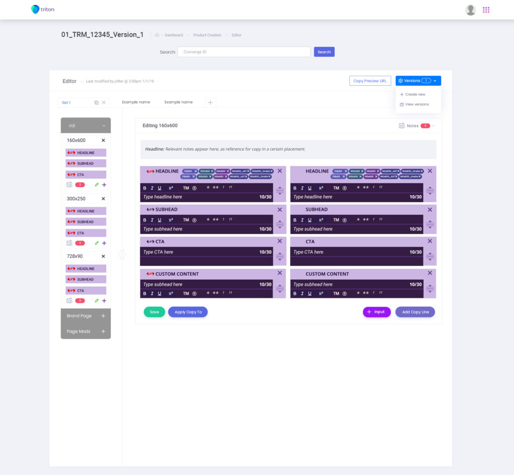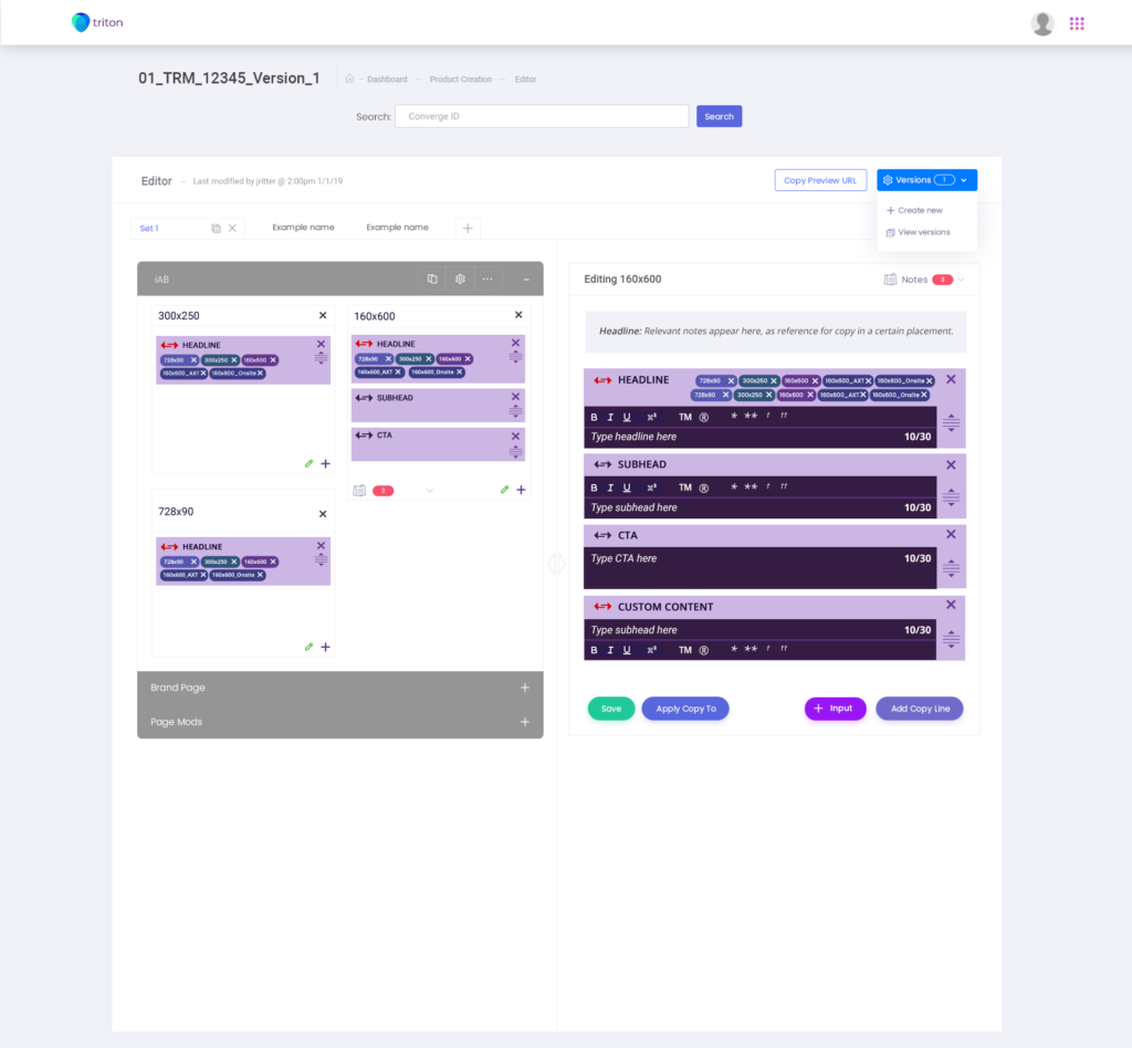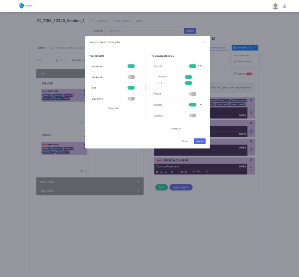 The new Triton workflow incorporated 3 milestones for integration: a dashboard, publisher selection/creation, and Copywriter editing tools (Headlines, subheads, copy formatting) all while being able to search for converge numbers(projects) at once.