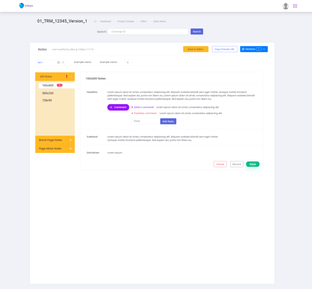 Products are available on the left side column, selected products are able to be edited with the most room given in the middle of the screen. Inside of each product, the user can select which type and version of product to edit along with the ability to sync the copy to the Sketch plug-in. I also tied publisher and supplier feedback to a notes UI integrated into products where the notes are shown for relevant feedback.